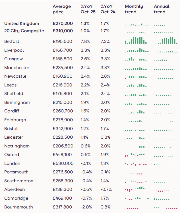 Genel olarak Birleşik Krallık Konut Fiyat Endeksimiz, ortalama fiyatların bir yıl öncesine göre %1,3 daha yüksek olduğunu gösteriyor. Bu oran geçen ayla benzer seviyede ve geçen yıl kaydedilen %1,7 yıllık artışın yalnızca biraz altında.